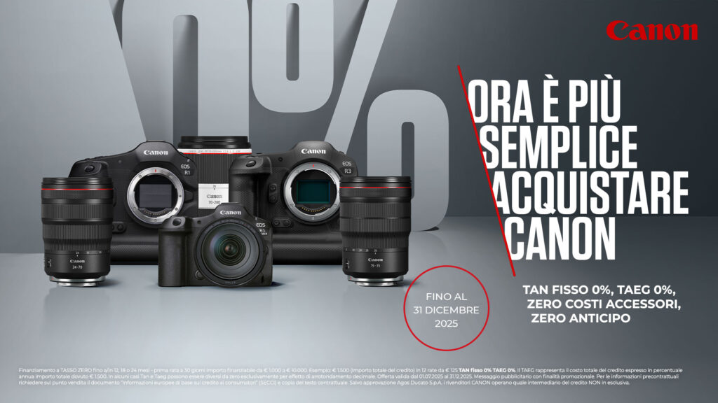 Fino al 31 dicembre 2025 puoi approfittare di un finanziamento a tasso zero con TAN fisso 0% TAEG 0% e prima rata a 30 giorni. Il finanziamento ha una durata fino a/in 24 mesi su una selezione di fotocamere del Sistema EOS R con prima rata a 30 giorni e importo finanziabile da € 1.000 a € 10.000*.